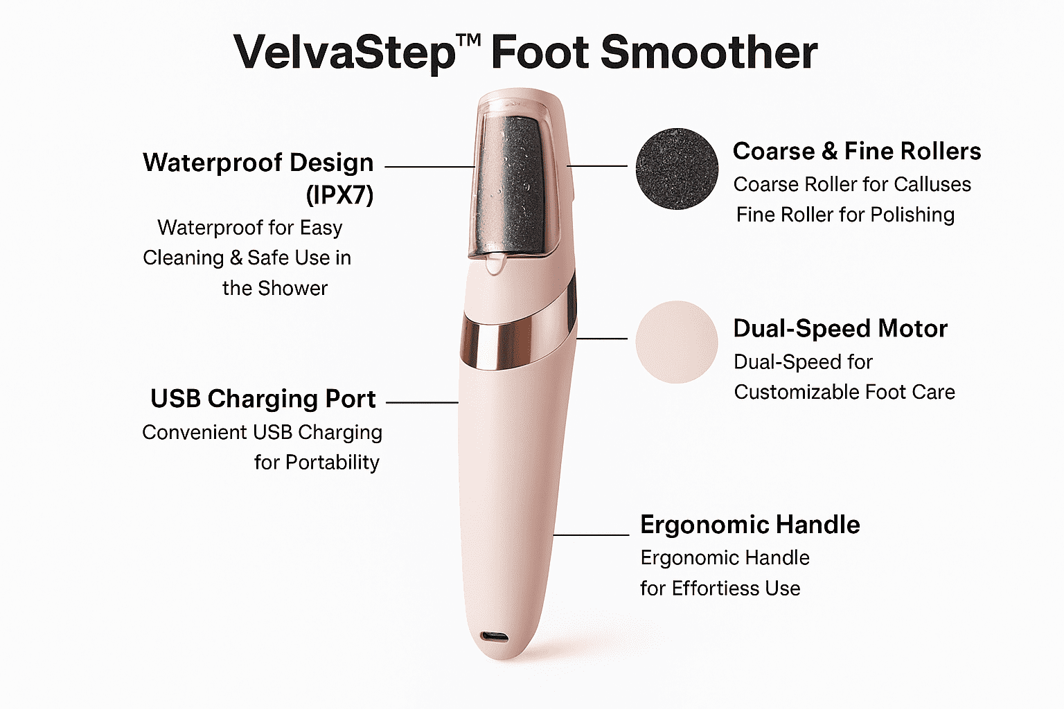 VelvaStep™ Foot Smoothe is your intelligent, curated solution for smooth, beautiful feet—crafted for those who value comfort, convenience, and modern self-care.